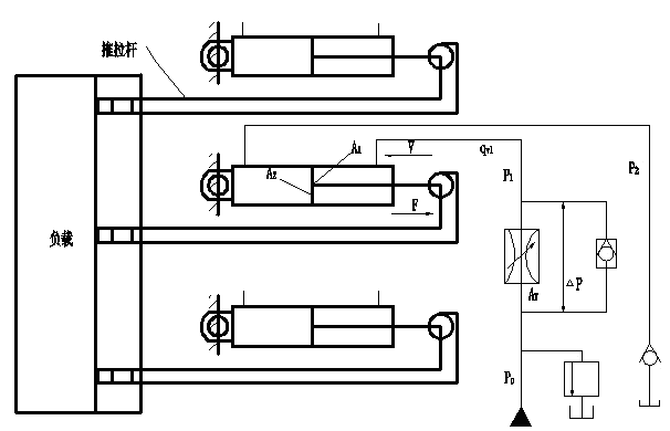 端頭1#、2#、3#支架液壓缸31、24、16結(jié)構(gòu)尺寸、布置方式相同,影響同步精度的因素,有液壓缸的外負載、泄漏、摩擦阻力;如圖2所示,速度負載特性,缸在穩(wěn)定工作時,受力平衡方程式為: