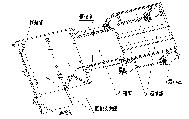 支架拆除平臺(tái)共分為三部分,分別為回撤支架部、伸縮部、起吊部,回撤支架部用于液壓支架的抽出及抹轉(zhuǎn),伸縮部用于連接、推移起吊部,起吊部用于支架的裝車(chē),如圖3所示。