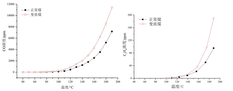 由表 4 實驗室測定不同變質程度的煤樣自燃傾向性指標參數(shù)可以看出,原生煤與變質煤均為Ⅰ類容易自燃煤層; 30 ℃煤的吸氧量表現(xiàn)為原生煤大于變質煤;但在反應溫度達到 70 ℃時,變質煤對于氧氣的消耗速率大于原生煤;結合衡量溫升速率快慢的交叉點溫度指標,體現(xiàn)為變質煤較原生煤加速氧化階段的氧化自燃特性更強烈;計算煤氧化動力學綜合指標判定指數(shù)表明火成巖侵入破壞使得變質煤較原生煤具有更高的自然發(fā)火的風險。由圖 2 對比分析可以看出變質煤較原生煤在低溫氧化階段標志性氣體產(chǎn)出溫度低,變現(xiàn)了變質煤更易發(fā)火的實踐經(jīng)驗。