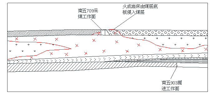 如圖 4 ,在南五 709 回采過程中工作面遇到火成巖沿煤層底板侵入煤體時,揭露的構造體向工作面涌入瓦斯,造成回風斷電中斷生產(chǎn),統(tǒng)計發(fā)現(xiàn)在停產(chǎn)面風排瓦斯量增加 4m3/min 。與其同向推進的南五 903 掘進工作面在施工底板錨索時,鉆孔位于火成巖床體內(nèi)時發(fā)生瓦斯噴出,造成回風斷電中斷生產(chǎn),統(tǒng)計發(fā)現(xiàn)風排瓦斯量增加 4m3/min 。巖漿在侵入過程中,破壞地層同時也在冷卻收縮易形成賦存瓦斯的裂隙,巖床下煤層受熱烘烤作用,瓦斯向上運移、富集在多孔的火成巖床內(nèi),采煤和打鉆作業(yè)破壞了蓋儲條件,對瓦斯富集區(qū)形成“天窗”出口,從而瓦斯大量異常涌出。