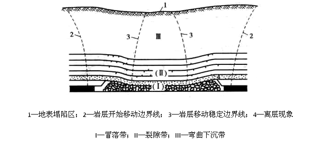 大興礦綜采工作面推進(jìn)后,采空區(qū)上覆巖層發(fā)生位移,根據(jù)巖層的變形情況分成冒落帶、裂隙帶和彎曲下沉帶三帶。冒落帶在三帶的最底層,它是由于采煤工作面的移架或放頂失去支撐力后的直接頂垮落形成的,垮落的很有次序,自上而下進(jìn)行。一般冒落帶垮落的下部巖石塊度比較小排列也不規(guī)則,而上部巖石塊度大,排列比較整齊。通常冒落帶的高度是采高的 2 ~ 4 倍。三帶的中間是裂隙帶,裂隙帶受冒落帶的垮落壓實(shí)影響而彎曲下沉,并出現(xiàn)離層現(xiàn)象,有的地方發(fā)生斷裂。裂隙帶的范圍變化受冒落帶巖性和采高影響。在裂隙帶上方是彎曲下沉帶,彎曲下沉帶的范圍比較大,厚度也比冒落帶和裂隙帶大,基本不產(chǎn)生裂縫,有也是極微小的裂縫,其地表附近形成沉降區(qū),這個(gè)區(qū)域在采空區(qū)的上方,往往要比開采區(qū)域要大。這三帶越靠近采空區(qū)的巖帶對(duì)采煤工作面的影響越大,也就是冒落帶影響最大,其次裂隙帶,最后彎曲下沉帶。