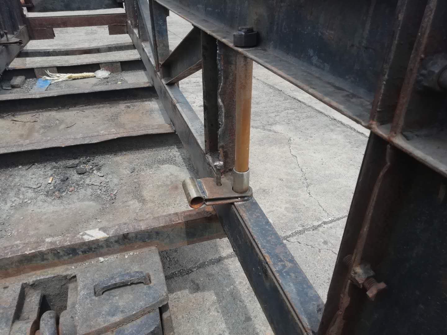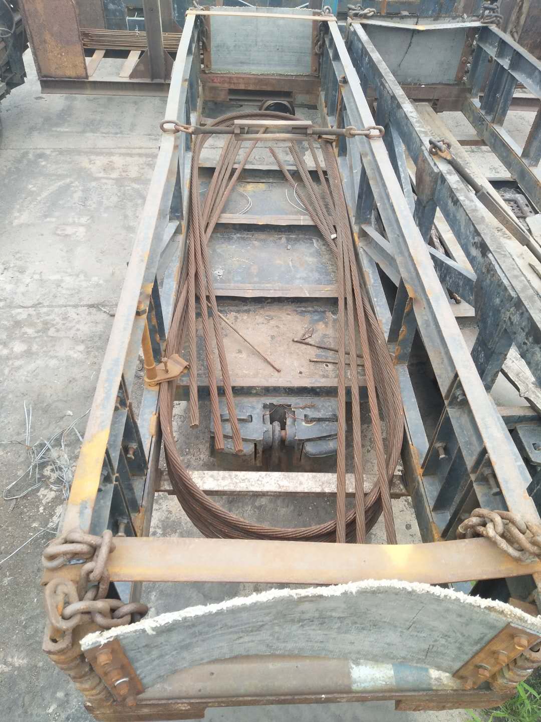 為了解決這些不安全因素,曉南礦研制了新型“錨索車”。該設(shè)計將原有錨索“8”字型裝車方法,改為“n”型對稱裝車方法,且保證單根錨索一頭頂在碰頭側(cè)活門處,以保證車輛不偏重,錨索不彈出。卸車時將錨索一頭夾在釋放裝置內(nèi),另一頭用棕繩連接,將錨索車碰頭側(cè)活門打開,2人同時拽動棕繩,即可將錨索拽至車輛下方,即節(jié)省了人工,又能避免錨索彈出傷人。同時設(shè)計制作了單根錨索頭套具,并配專用鎖緊扳手,防止在裝、卸車過程中造成錨索劈頭。