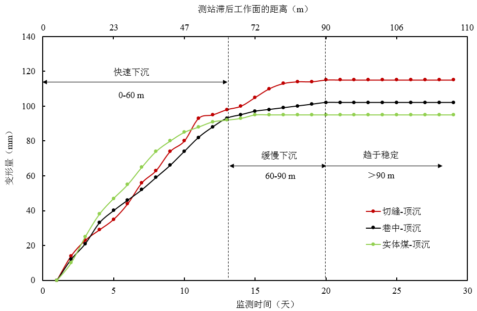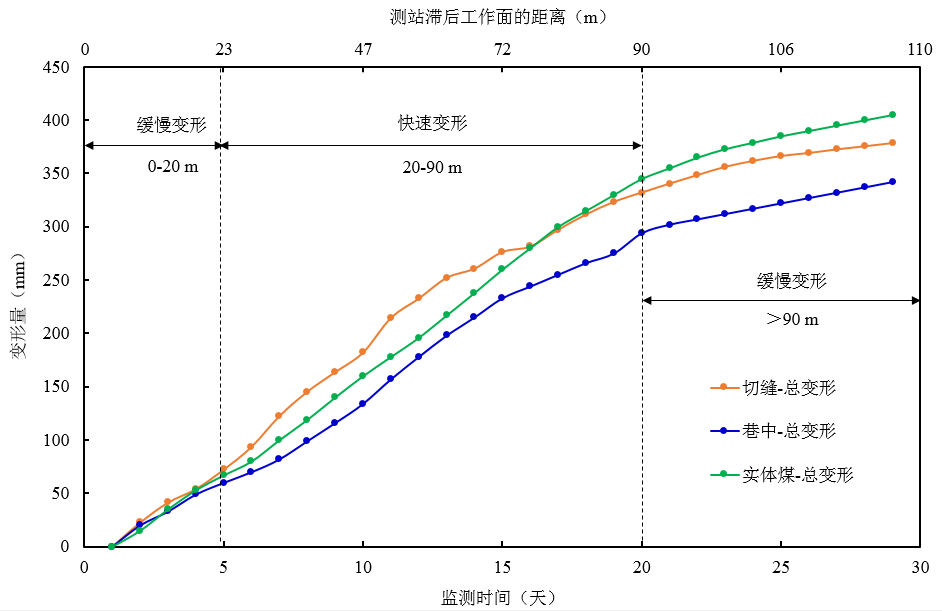 (3)綜合來看, 巷道頂?shù)装迨諗孔冃未笾驴煞譃槿齻€階段:第一個階段為架后約0-20 m,此段內(nèi)基本頂發(fā)生彎曲下沉,但尚未斷裂,底板巖體在端頭支架的約束下底鼓緩慢,因此,巷道總變形緩慢增加;第二階段為架后20-90 m,基本頂發(fā)生回轉(zhuǎn)斷裂,采空區(qū)矸石未壓實,底部巖體在兩側(cè)支承應力作用下發(fā)生底鼓,尤其是實體煤一側(cè)集中應力較大,因此,巷道總變形快速增大;第三階段為架后90 m以后,采空區(qū)矸石逐漸壓實,頂板下沉速度顯著降低,趨于穩(wěn)定,但是,巷道底部巖體仍為穩(wěn)定,持續(xù)發(fā)生緩慢底鼓,因此,巷道總變形仍緩慢進行。