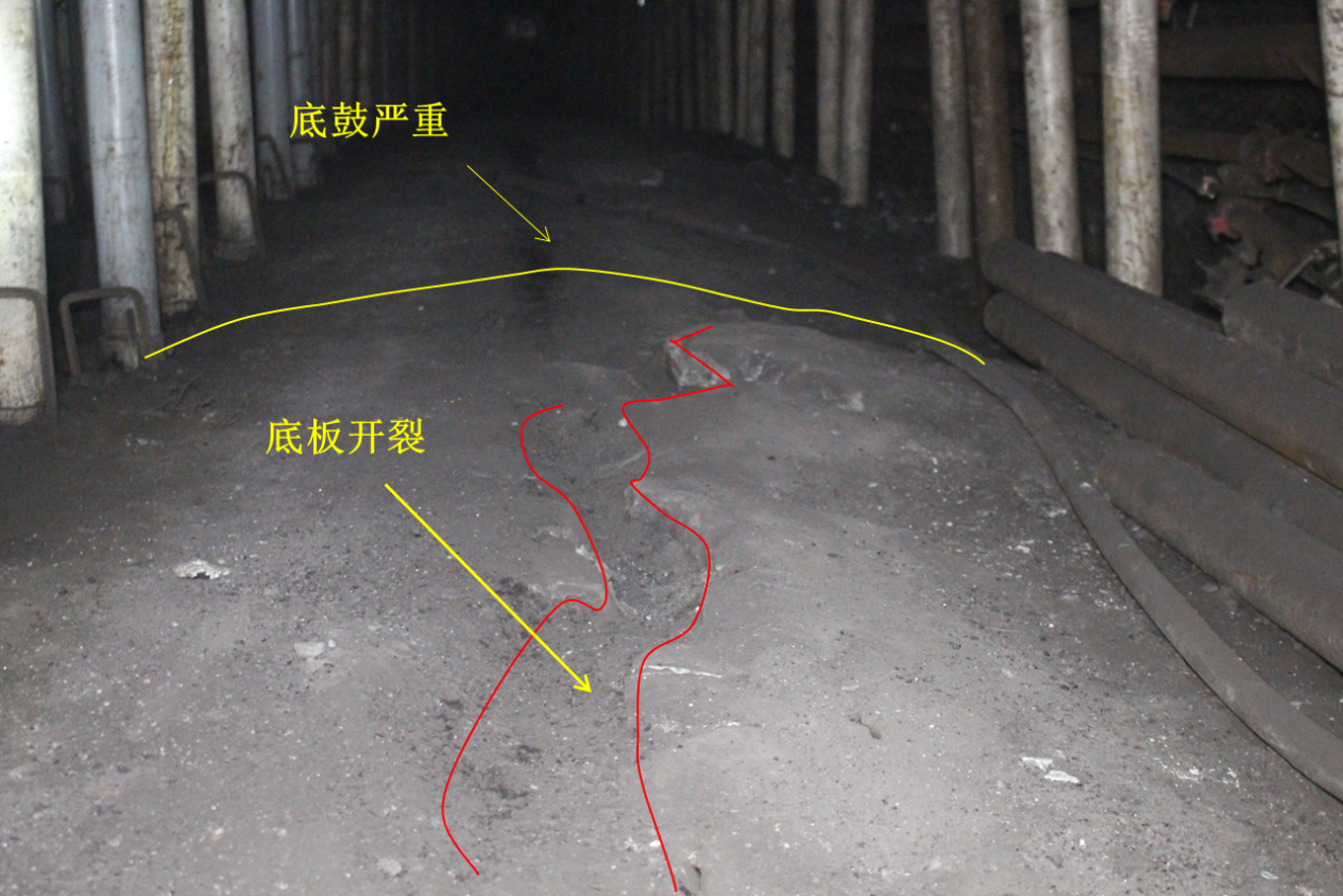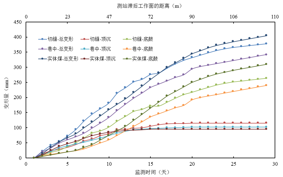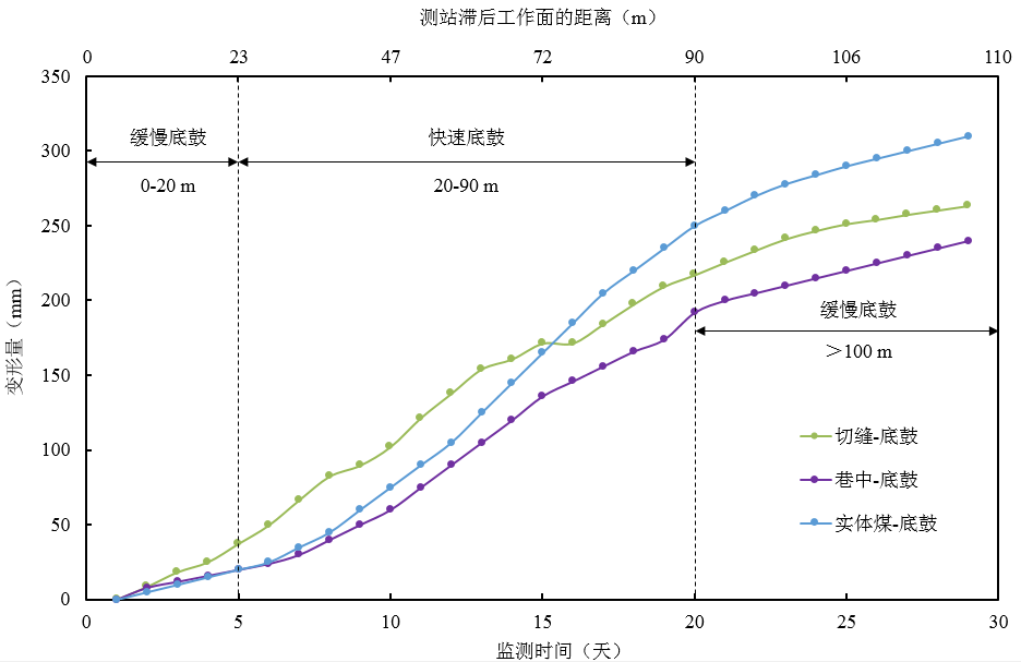 1、滯后工作面110m,頂板壓力和頂板變形趨于穩(wěn)定,但巷道持續(xù)底鼓嚴重,巷道總變形仍未穩(wěn)定。