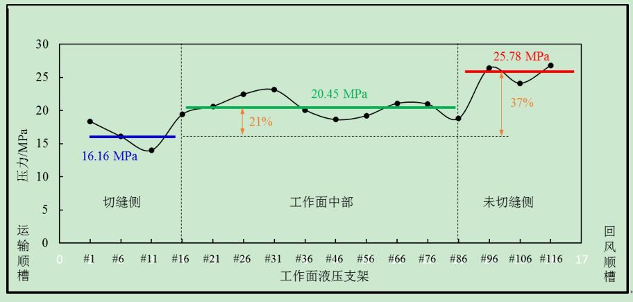 (2)切縫側(cè)卸壓顯著,其液壓支架平均壓力為16.16 MPa,影響范圍0-20 m;工作面中部受切縫的影響,液壓支架平均壓力為20.45 MPa,影響范圍20-100 m;工作面右側(cè)未受切縫的影響,液壓支架平均壓力為25.78 MPa,范圍100-210 m。