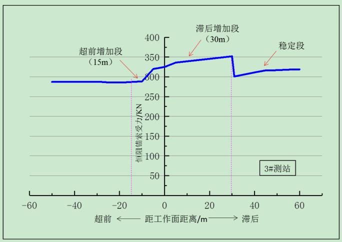 通過曲線分析可以得到錨索應力變化的具體情況,曲線增大起始位置為超前工作面15m處,工作面回采過后,錨索受力開始增加,滯后工作面30m處時錨索受力達到350KN,之后錨索受力變化不大。