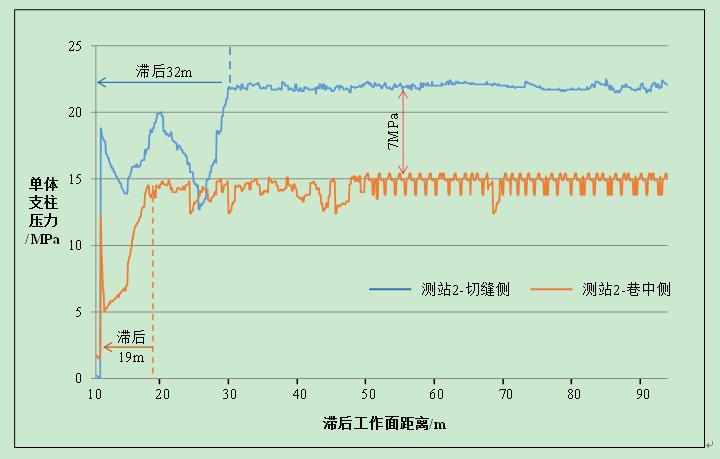 (2)切縫側(cè)滯后工作面 32m 之內(nèi),單體壓力出現(xiàn)波動,滯后工作面32m后穩(wěn)定在23MPa,分析原因是底鼓和頂板來壓多重因素的影響。巷中側(cè)單體壓力滯后工作面19m處時壓力穩(wěn)定,說明巷中側(cè)單體壓力受頂板壓力影響小于切縫側(cè)單體。