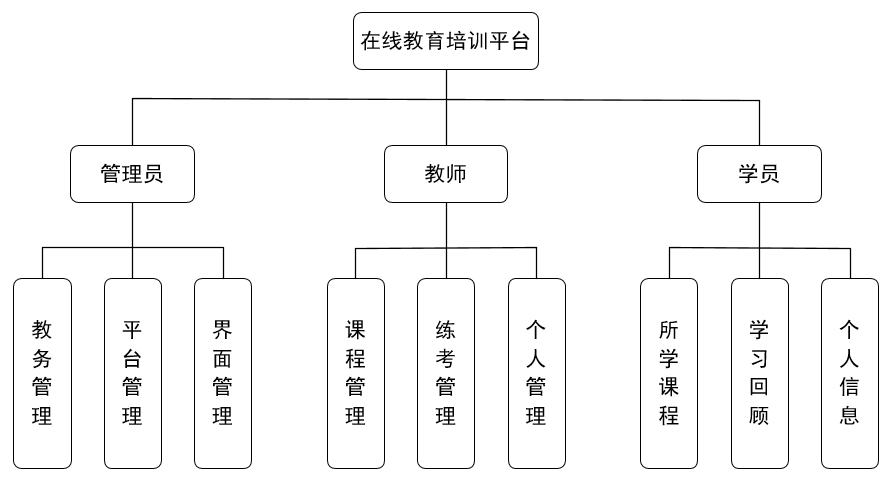 平臺(tái)分為三種角色,分別為管理員、教師和學(xué)員。三種賬號(hào)有各自的登錄窗口,根據(jù)不同角色的職責(zé)具有相應(yīng)的系統(tǒng)功能。具體系統(tǒng)結(jié)構(gòu)詳見(jiàn)圖2。