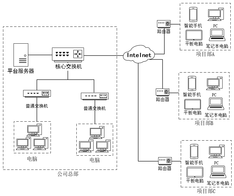 現(xiàn)階段光纖與4G網(wǎng)絡(luò)的覆蓋面很廣,項(xiàng)目部的網(wǎng)絡(luò)接入問(wèn)題可以得到很好的保障。我們只需將平臺(tái)部署在公司總部的機(jī)房?jī)?nèi),分配專(zhuān)用服務(wù)器并配置外網(wǎng)IP,選定簡(jiǎn)單好記的專(zhuān)用域名,通過(guò)第三方平臺(tái)解析指向外網(wǎng)IP,讓員工可以通過(guò)域名訪問(wèn)平臺(tái)。同時(shí),直接分配三層交換機(jī)的千兆端口與平臺(tái)服務(wù)器直連,保證平臺(tái)的訪問(wèn)速度。系統(tǒng)部署的網(wǎng)絡(luò)拓?fù)鋱D見(jiàn)圖1。另外,將移動(dòng)端APP程序的下載連接部署在平臺(tái)首頁(yè),讓員工可以通過(guò)二維碼掃描下載移動(dòng)端APP(僅Android)。這樣不論你在任何地方,只要有網(wǎng)絡(luò)即可訪問(wèn)平臺(tái),參加學(xué)習(xí)及考試。