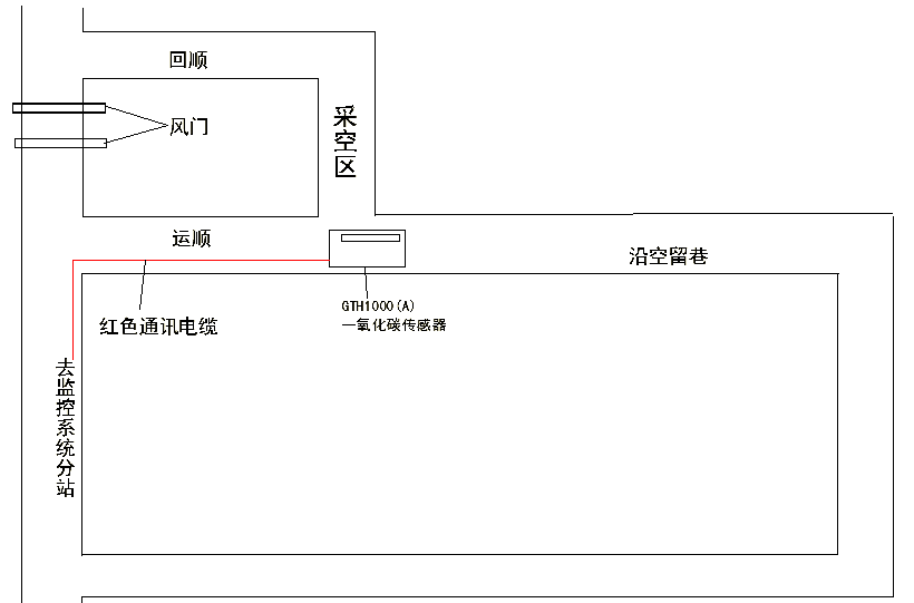 ? ? 4.1.5因為自然發(fā)火是一個較慢長的變化,所以在沿空留巷的末端也就是N1-1502工作面運順端頭,安設(shè)一臺一氧化碳傳感器,來檢測通過沿空留巷風(fēng)流的一氧化碳濃度,以此來判斷沿空留采空區(qū)是否有自然現(xiàn)象及采空區(qū)是否有風(fēng)漏入沿空留巷,從而來分析采空區(qū)的自然發(fā)火情況,當(dāng)一氧化碳含量達到100ppm時,說明自燃發(fā)火存在自燃發(fā)炎現(xiàn)象。一氧化碳傳感器的安設(shè)數(shù)量可以根據(jù)實際情況具體安設(shè),增加密度,CO傳感器的安設(shè)位置如圖7所示: