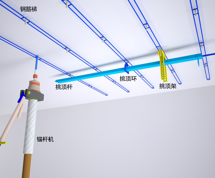 傳統(tǒng)的臨時(shí)支護(hù),全過程均為人工操作,步驟較多,視頂板情況安設(shè)二套或三套挑頂架、挑頂桿、挑頂環(huán),來挑起鋼筋梯。此流程以下問題:對(duì)頂板沒有初撐力,屬于被動(dòng)支護(hù),安全可靠性差;流程十分繁瑣,需前后人員配合嫻熟,且易出現(xiàn)人身磕碰情況;挑頂桿與頂板為點(diǎn)接觸,挑頂縱深范圍僅為2m,不能完全貼合頂板。