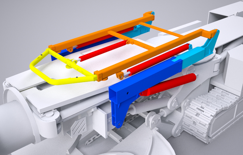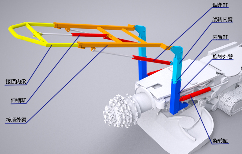 機(jī)載支護(hù)在接頂?shù)倪^程中,已打注錨桿、錨索的突出部分會(huì)對(duì)接頂外梁的移動(dòng)、上升產(chǎn)生影響,為了避免、減少刮碰。接頂外梁的俯視投影面積要盡可能的小。所以,只在梁的中間設(shè)置了一個(gè)伸縮缸。最后一道梁的位置也盡可能的靠前布置。