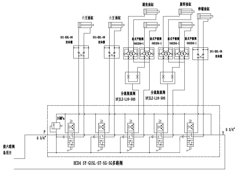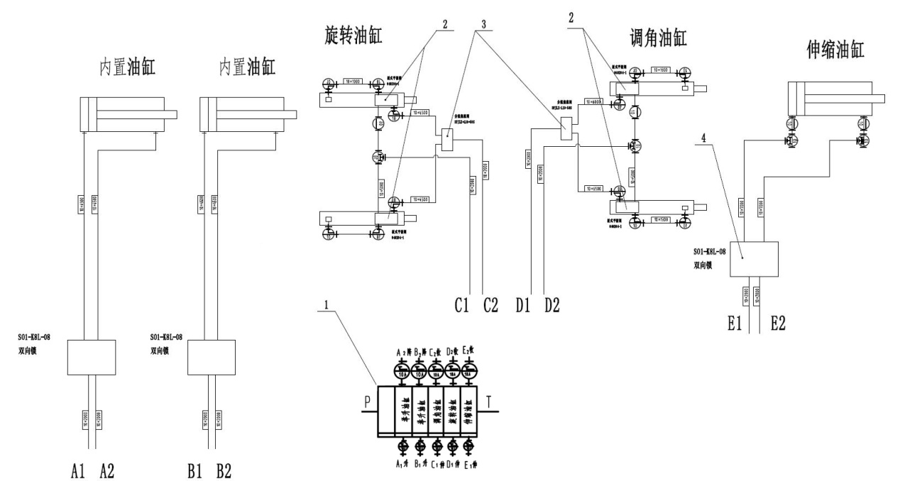 液壓結(jié)構(gòu)如圖4所示,分別由五聯(lián)閥組×1、分流集流閥×2、雙向鎖×3、板式平衡閥×4及各種膠管、接頭等組成。從掘進(jìn)機(jī)聯(lián)閥組件取油,通過五聯(lián)閥組控制各缸體:二個(gè)內(nèi)置油缸分別由2片閥控制,實(shí)現(xiàn)旋轉(zhuǎn)內(nèi)臂的不同步升降,以滿足頂板不平時(shí)的情況;旋轉(zhuǎn)油缸由1片閥控制,實(shí)現(xiàn)旋轉(zhuǎn)臂的轉(zhuǎn)動(dòng),調(diào)角油缸由1片閥控制,實(shí)現(xiàn)接頂外梁的水平接頂,單伸縮油缸由1片閥控制,實(shí)現(xiàn)接頂內(nèi)梁的向前伸出。