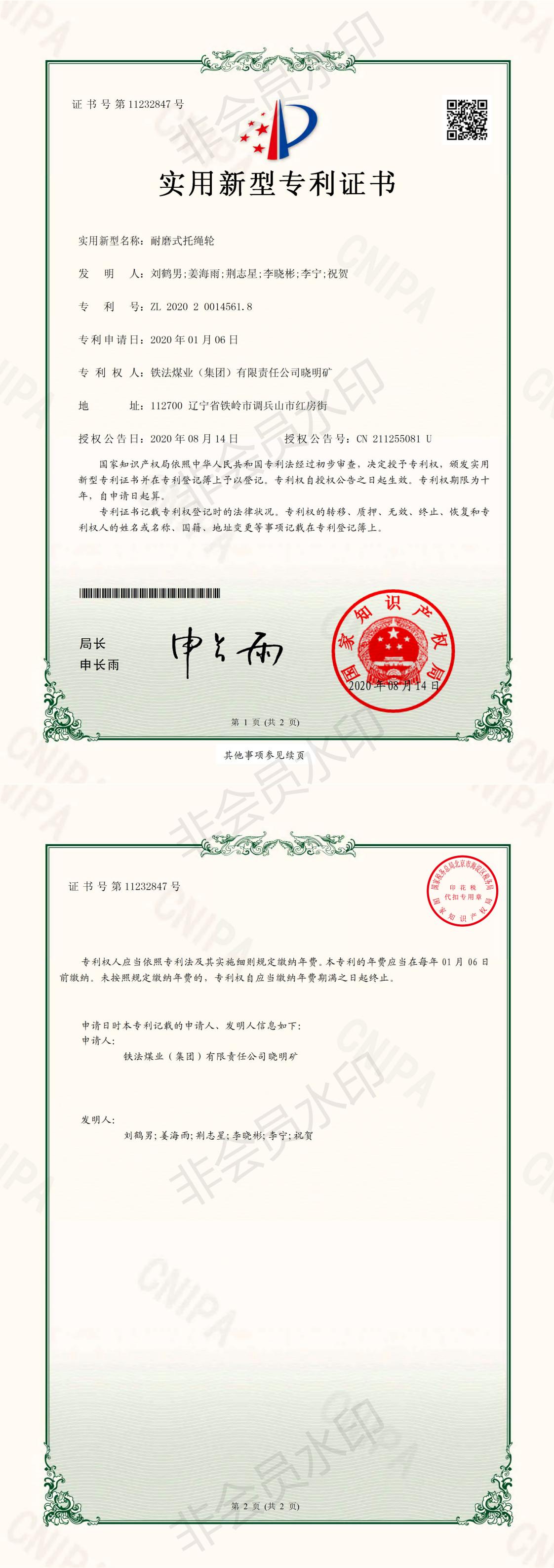 近日,曉明礦域外項(xiàng)目部自行研制的“耐磨式托繩輪”獲得國(guó)家知識(shí)產(chǎn)權(quán)局實(shí)用新型專利授權(quán),專利號(hào)為:ZL 2020 2 0014561.8。