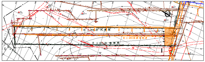 分析原因?yàn)椋罕倍?/span>1203回順32#高位鉆場(chǎng)鄰近工作面鉆孔衰減,而后續(xù)的31#、30#鉆場(chǎng)斜交鉆孔設(shè)計(jì)垂高偏高,鉆孔均沒有與裂隙帶連通。30#鉆場(chǎng)鉆孔設(shè)計(jì)因要躲開32#高位鉆場(chǎng)口頂板錨桿錨索,致使垂高偏高,沒有發(fā)揮作用;此時(shí)29#高位鉆場(chǎng)未開始抽采,因而出現(xiàn)斷檔現(xiàn)象。因此,斜交鉆孔的合理層位選擇非常重要。