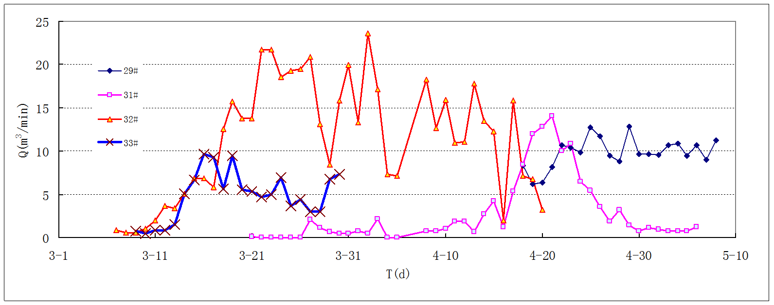 北二1203工作面在整個(gè)開采過程中,共對(duì)31個(gè)鉆場(chǎng)計(jì)施工斜交鉆孔進(jìn)行了抽采,鉆孔工程量為30527m,抽采瓦斯純量392萬(wàn)m3。自2月22日回采以來至8月末,回順35#~20#鉆場(chǎng)陸續(xù)對(duì)采空區(qū)及鄰近層瓦斯進(jìn)行了抽采。從鉆場(chǎng)斜交鉆孔抽采數(shù)據(jù)統(tǒng)計(jì)來看,也存在著鉆場(chǎng)有效抽采鉆孔影響段較短、抽采效果一般、抽采時(shí)間及鉆孔參數(shù)需優(yōu)化等問題。為了分析各鉆場(chǎng)抽采接續(xù)的相互影響,作出33#、32#、31# 、29#鉆場(chǎng)斜交鉆孔抽采量隨推進(jìn)時(shí)間變化曲線如圖3所示。