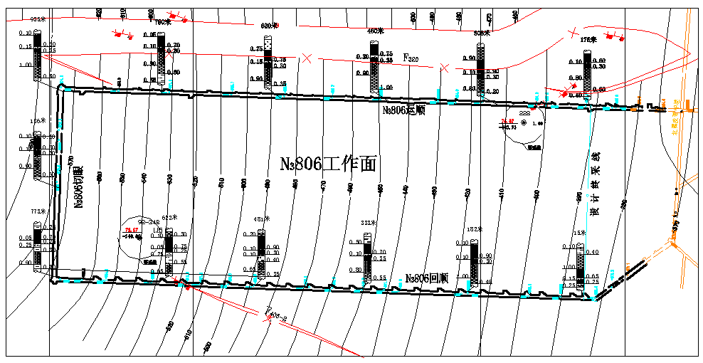 N3806工作面位于北三采區(qū)八層六段,運(yùn)順長943m,回順長780m,切眼長260m。工作面所在區(qū)域地質(zhì)構(gòu)造簡單,根據(jù)工作面掘進(jìn)實見情況,N3806工作面回順實見F406-2斷層一處,傾向116°、傾角60°、落差0.5m,預(yù)計延伸至工作面內(nèi)10m,對工作面回采有一定影響,如圖1所示。
