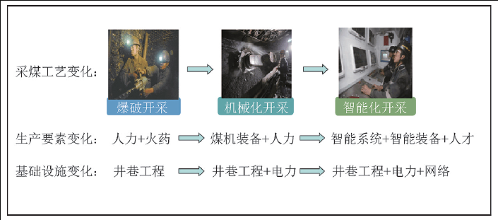 煤炭開采經(jīng)歷了爆破開采、機(jī)械化開采,目前已向智能化開采演進(jìn)與發(fā)展。在不同階段,主要生產(chǎn)要素與基礎(chǔ)設(shè)施也隨之發(fā)生變化并升級(jí),煤炭不同開采階段生產(chǎn)要素與基礎(chǔ)設(shè)施變化如圖1所示。