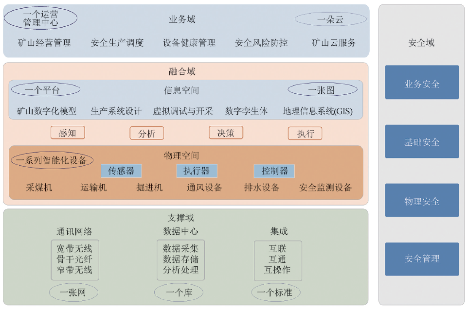(2)在融合域,“一系列智能化設(shè)備”構(gòu)成物理空間,“一張圖”與“一個(gè)平臺(tái)”包括各類三維仿真軟件、數(shù)字孿生體,構(gòu)成信息空間。融合域?qū)崿F(xiàn)信息系統(tǒng)與物理系統(tǒng)交互映射與深度融合,從而實(shí)現(xiàn)礦山生產(chǎn)活動(dòng)信息的智能感知、分析決策、工業(yè)自動(dòng)化控制和安全生產(chǎn)監(jiān)控等。