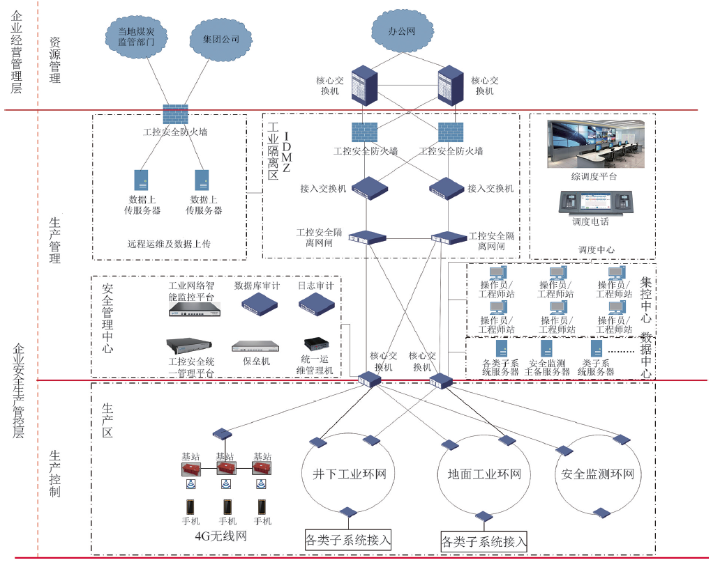 (3)以“生產(chǎn)安全、網(wǎng)絡(luò)安全”為保障,提供安全服務(wù)。目前煤礦生產(chǎn)安全保障系統(tǒng)是智能煤礦的重要建設(shè)內(nèi)容,如“六大避險(xiǎn)系統(tǒng)”以及“風(fēng)險(xiǎn)預(yù)控系統(tǒng)”都已作為礦井安全的建設(shè)重點(diǎn),但在信息化時(shí)代,網(wǎng)絡(luò)安全也是重中之重,要與生產(chǎn)安全放在同等地位。煤礦要建設(shè)安全生產(chǎn)控制專網(wǎng),在生產(chǎn)控制專網(wǎng)與企業(yè)辦公網(wǎng)之間,構(gòu)建工業(yè)安全隔離區(qū),實(shí)現(xiàn)礦山信息的安全性。在企業(yè)經(jīng)營(yíng)管理層、企業(yè)安全生產(chǎn)管控層形成以工業(yè)信息安全防護(hù)為重點(diǎn)的縱深防御,利用工業(yè)隔離網(wǎng)閘、工業(yè)網(wǎng)絡(luò)審計(jì)、工業(yè)態(tài)勢(shì)感知等技術(shù)手段,幫助礦山實(shí)現(xiàn)工業(yè)信息安全保障能力建設(shè)。煤炭企業(yè)典型網(wǎng)絡(luò)安全防護(hù)拓?fù)鋱D如圖 9 所示。