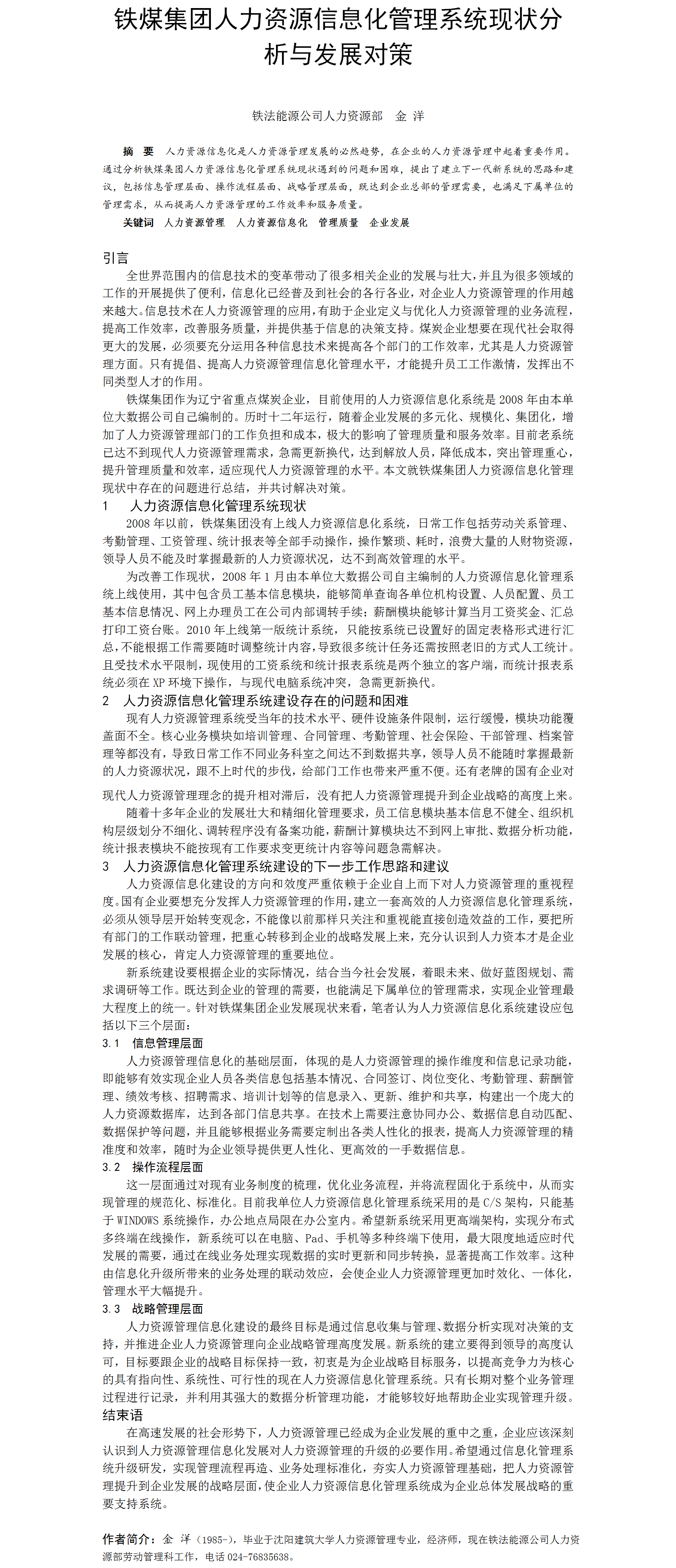 第48屆等級獎?wù)撐?--鐵煤集團(tuán)人力資源信息化管理系統(tǒng)現(xiàn)狀分析與發(fā)展對策