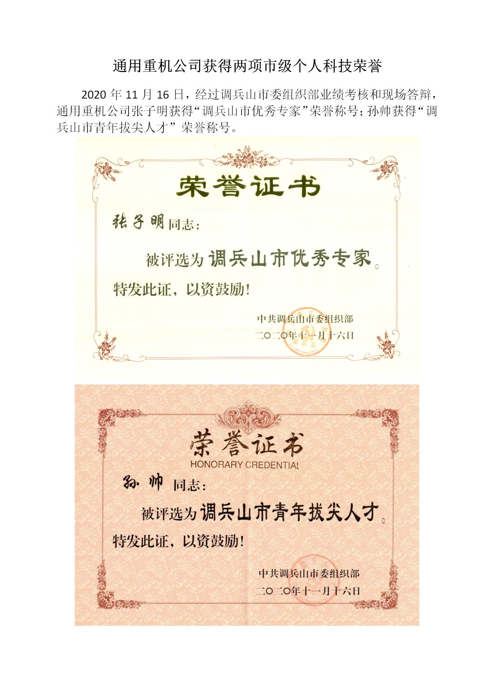 通用重機公司獲得兩項市級個人科技榮譽