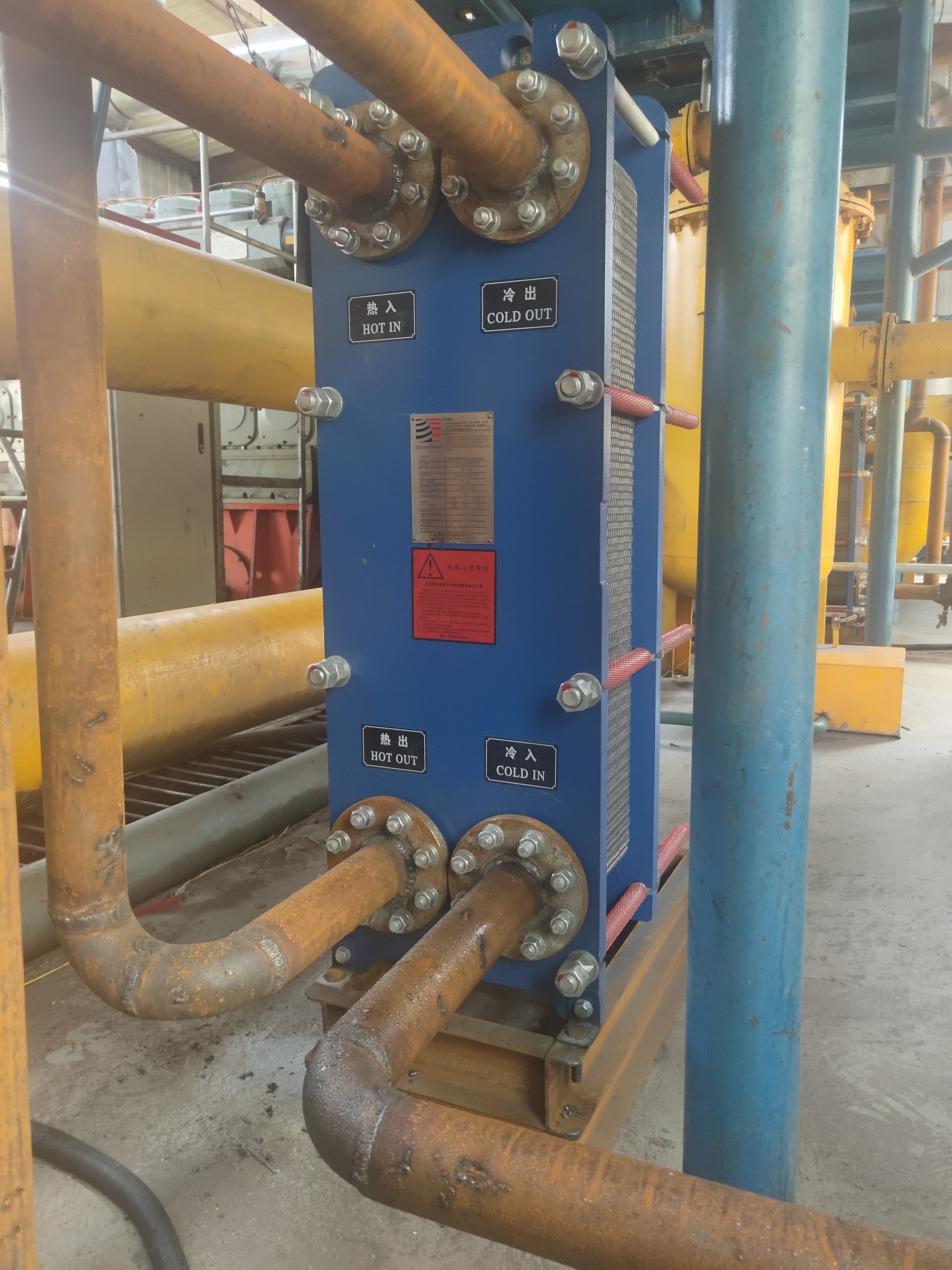換熱器選用的是睿能太宇能源技術(shù)公司生產(chǎn)的SH0640M16-52型,傳輸介質(zhì)為的水—水的板式換熱器,換熱面積可達(dá)12.5㎡,是用薄金屬板壓制成具有一定波紋形狀的換熱板片,然后疊裝,用夾板、螺栓緊固而成的一種換熱器。各種板片之間形成薄矩形通道,通過半片進(jìn)行熱量交換。工作流體在兩塊板片間形成的窄小而曲折的通道中流過。冷熱流體依次通過流道,中間有一隔層板片將流體分開,并通過此板片進(jìn)行換熱。板式換熱器的結(jié)構(gòu)及換熱原理決定了其具有結(jié)構(gòu)緊湊、占地面積小、傳熱效率高、操作靈活、應(yīng)用范圍廣、熱損失小、安裝和清洗方便等特點(diǎn)。低溫預(yù)熱系統(tǒng)工藝圖如圖2所示,板式換熱器實(shí)際安裝如圖3所示。