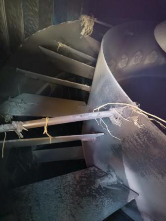 當(dāng)煤質(zhì)變化時,應(yīng)通過實驗來確定煤粉的經(jīng)濟細度,通常最佳細度控制在R90=20~25%。通過檢測,發(fā)現(xiàn)5號制粉系統(tǒng)煤粉均勻度差。打開人孔檢查發(fā)現(xiàn)粗粉分離器的折向擋板開度與實際指示不一致,開度不均勻。檢修人員調(diào)整后,擋板位置與實際相符,開度均勻。再次檢測,煤粉顆粒均勻度恢復(fù)正常。圖2、圖3分別為調(diào)整前、后5號粗粉分離器折向擋板位置對比。因此,運行中要定期檢測煤粉細度和均勻性,有問題及時調(diào)整。