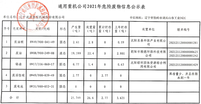 通用重機公司2021年危險廢物信息公開