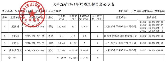 大興礦2021年危險廢物信息公示