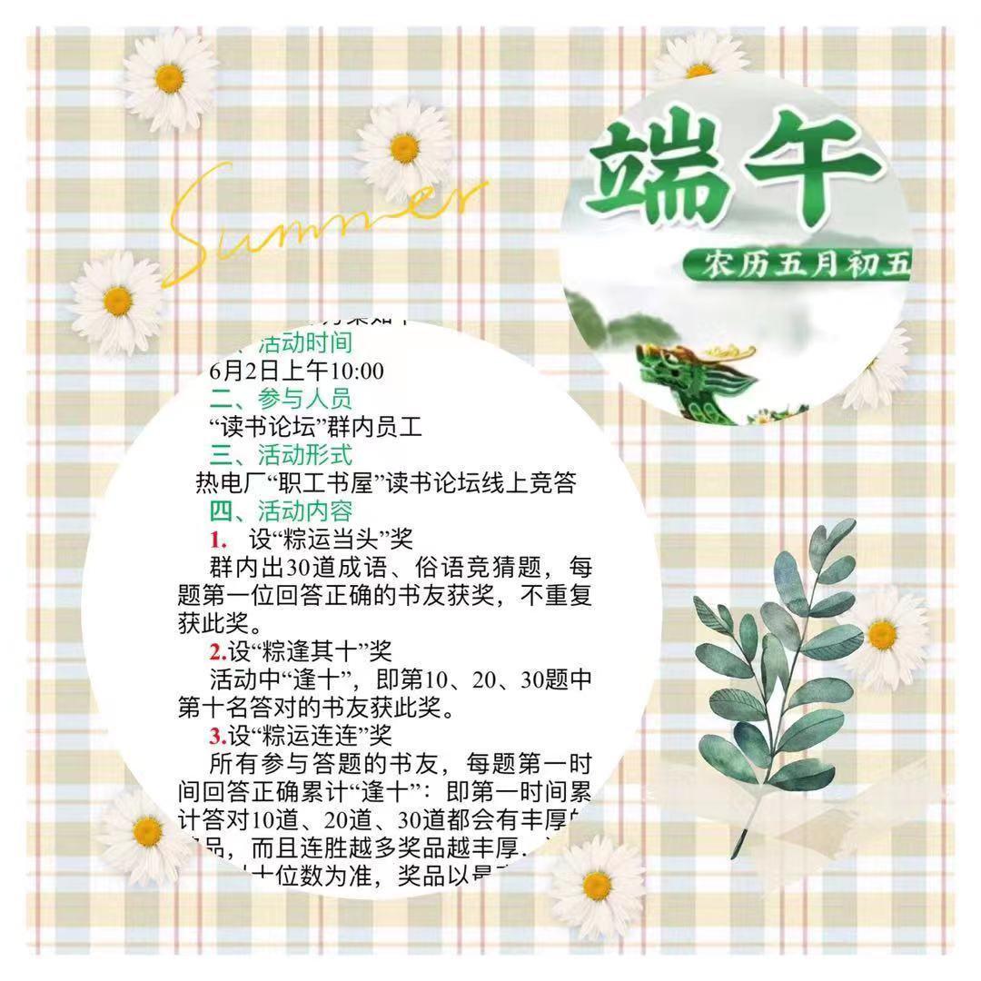 熱電廠工會(huì)職工書(shū)屋舉辦“祝福端午安康?巧學(xué)傳統(tǒng)文化”線上競(jìng)答活動(dòng)