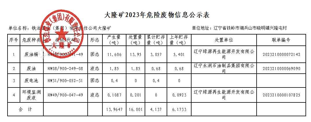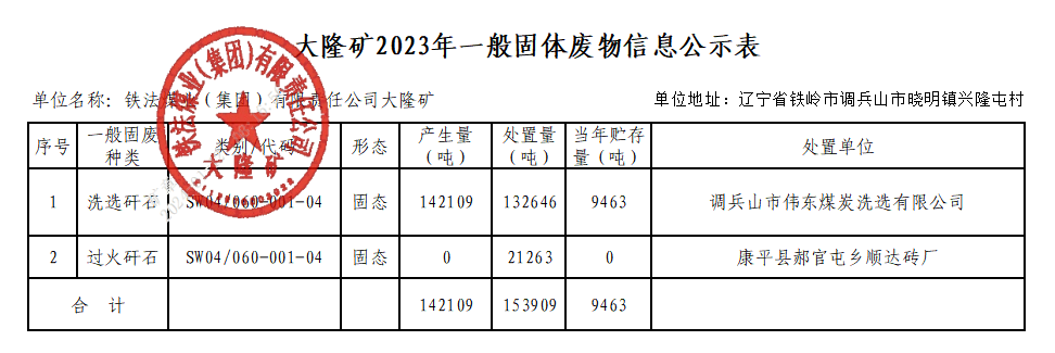 大隆礦2023年度固體廢物污染環(huán)境防治信息