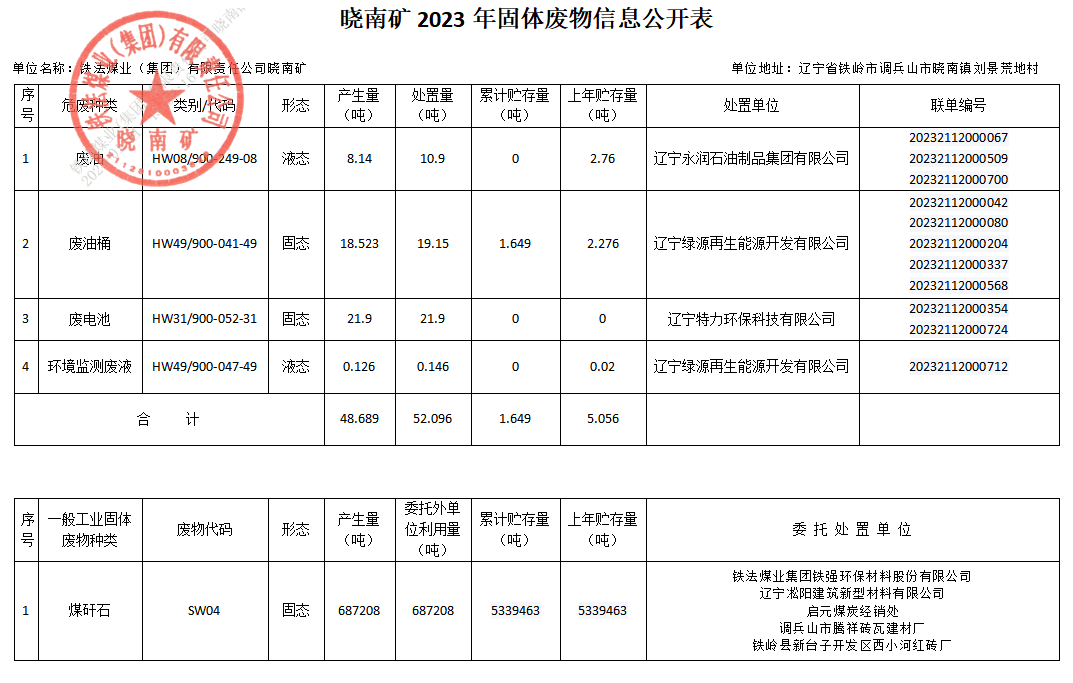 曉南礦2023年度固體廢物污染環(huán)境防治信息