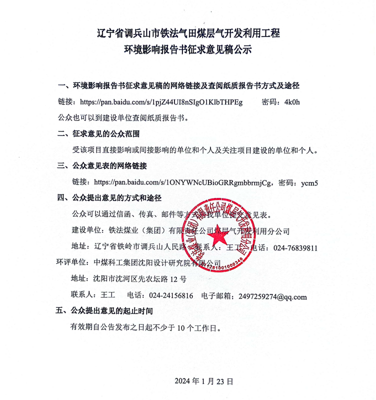 遼寧省調(diào)兵山市鐵法氣田煤層氣開發(fā)利用工程環(huán)境影響報(bào)告書征求意見稿公示