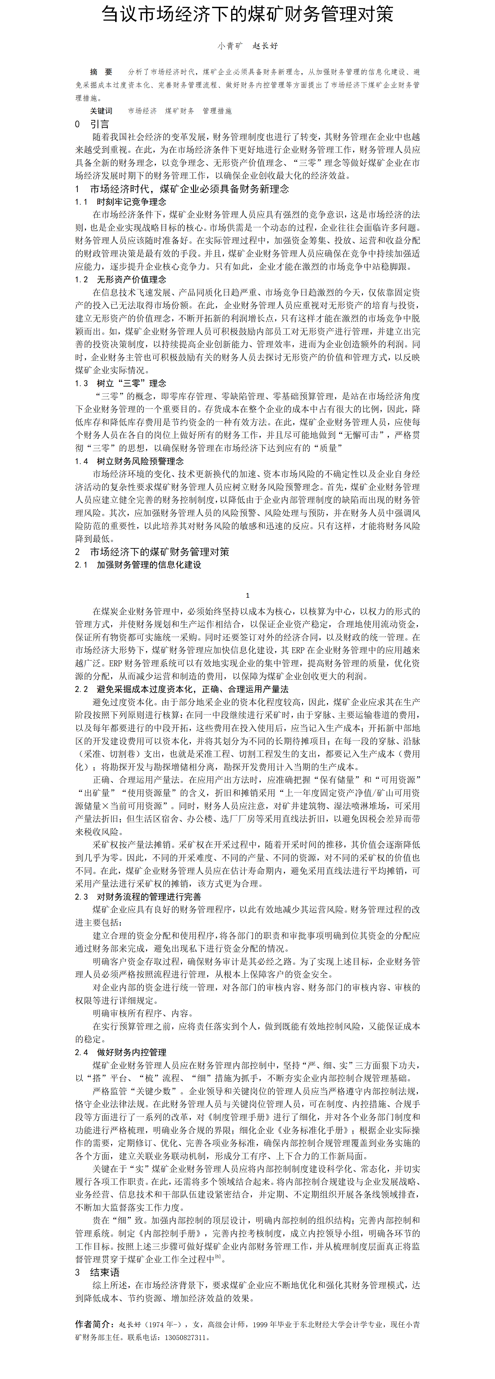 第58屆等級獎?wù)撐?--芻議市場經(jīng)濟(jì)下的煤礦財務(wù)管理對策