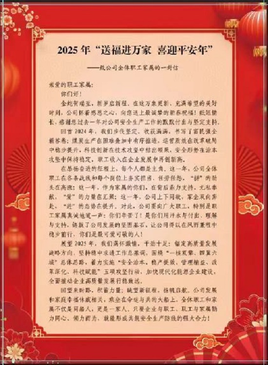 為進(jìn)一步夯實(shí)企業(yè)安全文化根基,提升職工安全素養(yǎng),充分調(diào)動(dòng)職工家屬參與安全管理的積極性、主動(dòng)性和創(chuàng)造性,凝聚“企業(yè)抓安全、家庭助安全、職工保安全”的強(qiáng)大合力,為公司持續(xù)安全穩(wěn)定發(fā)展提供有力支撐,在2025年新春佳節(jié)即將來(lái)臨之際,公司工會(huì)開(kāi)展了2025年“送福進(jìn)萬(wàn)家 喜迎平安年”——致職工家屬一封信活動(dòng)。
