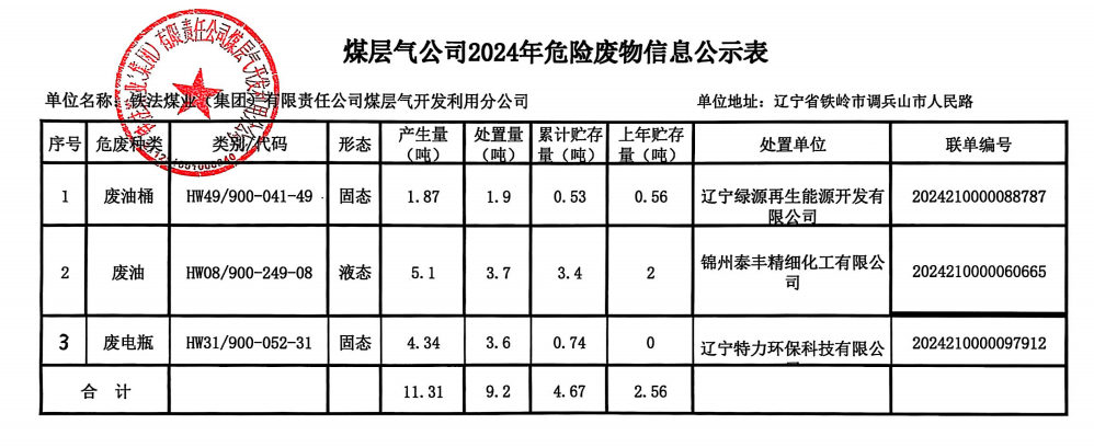 煤層氣公司2024年度固體廢物污染環(huán)境防治信息