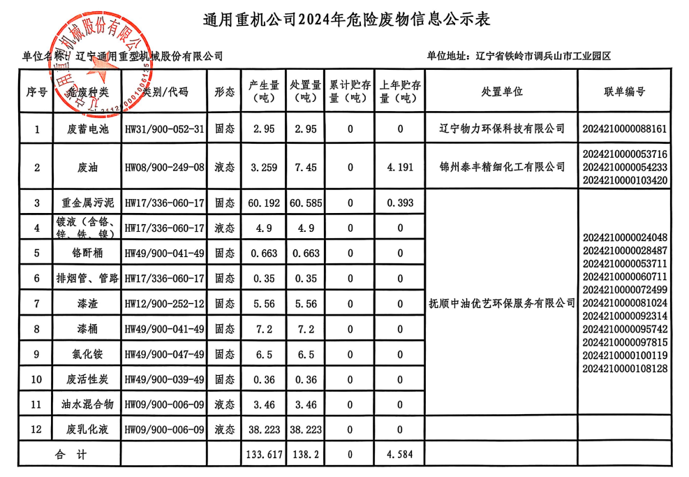 通用重機(jī)公司2024年度固體廢物污染環(huán)境防治信息