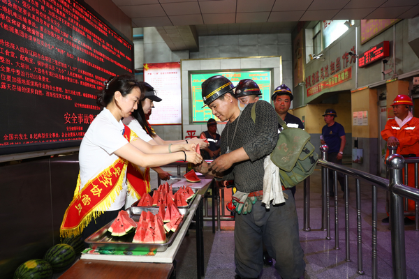 該礦還在井口搭建場地,為升入井職工送上現(xiàn)切的大西瓜,沖泡冰涼爽口的酸梅湯,讓大家在炎炎夏日里實實在在感受到冰爽與清涼。