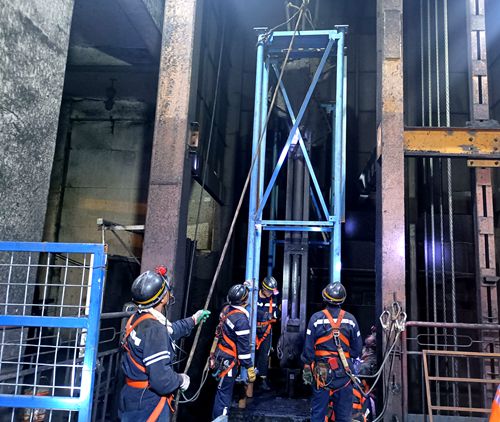 最棘手的硬仗當(dāng)屬大平礦主井罐道更換。這座井筒深達(dá)687米、直徑5.5米,內(nèi)部的鋼罐道是箕斗升降的“軌道”,常年摩擦下,部分區(qū)段磨損嚴(yán)重,若不及時更換,極可能引發(fā)箕斗卡頓,甚至誘發(fā)安全事故。劉明和部室人員與機電一隊創(chuàng)新采用“雙層吊架作業(yè)方案”,解決了施工中的許多難題,極大地提高了施工的安全性和施工效率。