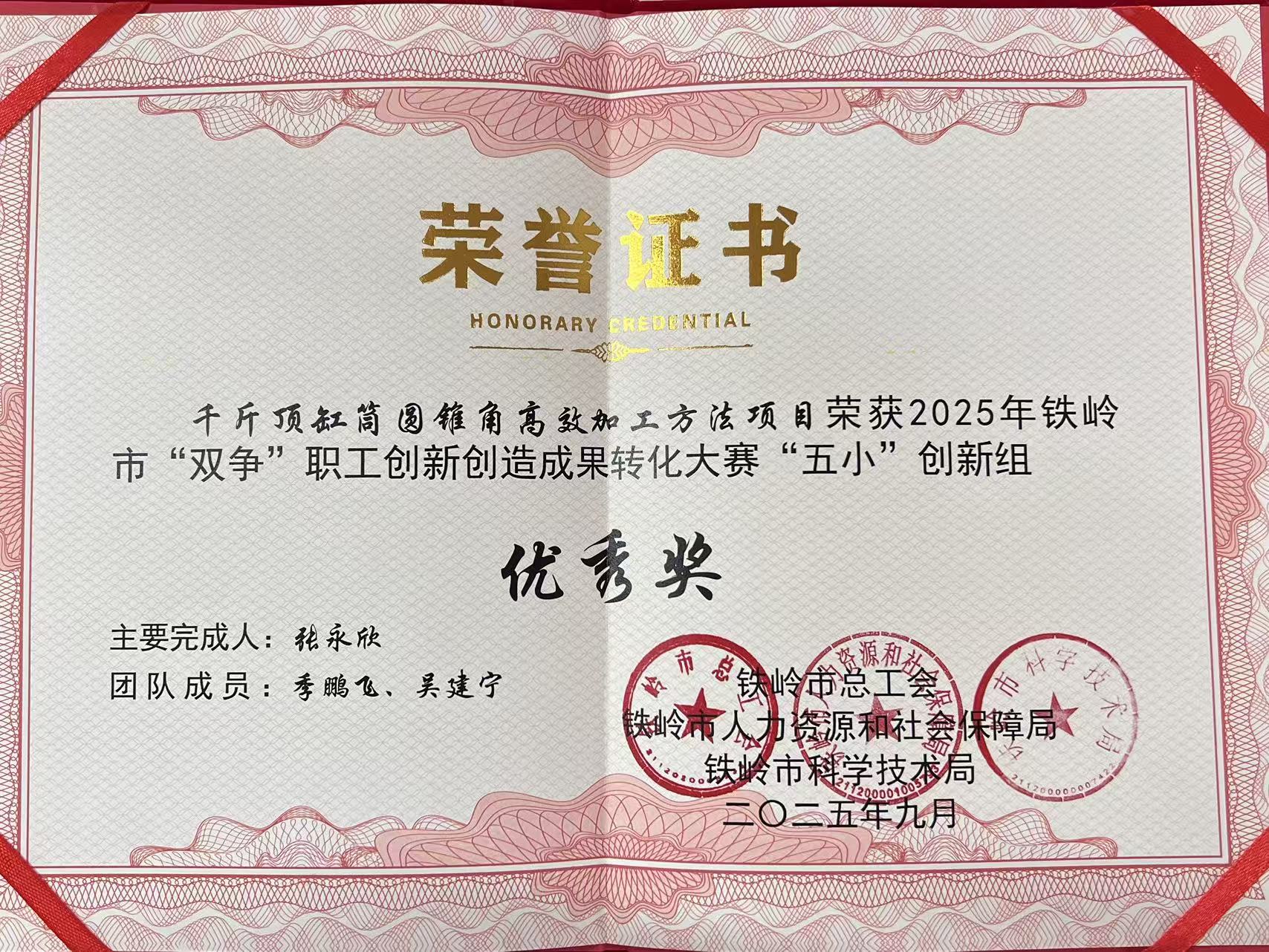 近日,遼寧通用重型機械股份有限公司機加工車間職工張永欣、李鵬飛、吳建寧團隊自主研發(fā)的“自動復位調心夾具與獨立進給車刀系統(tǒng)”榮獲“2025年鐵嶺市‘雙爭’職工創(chuàng)新創(chuàng)造成果轉化大賽”優(yōu)秀獎。