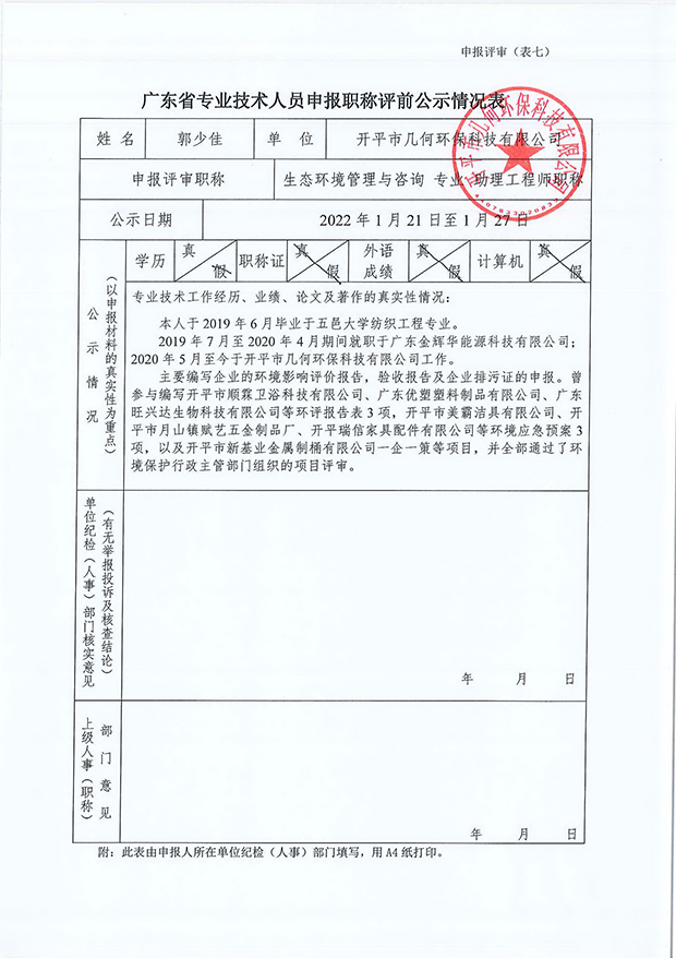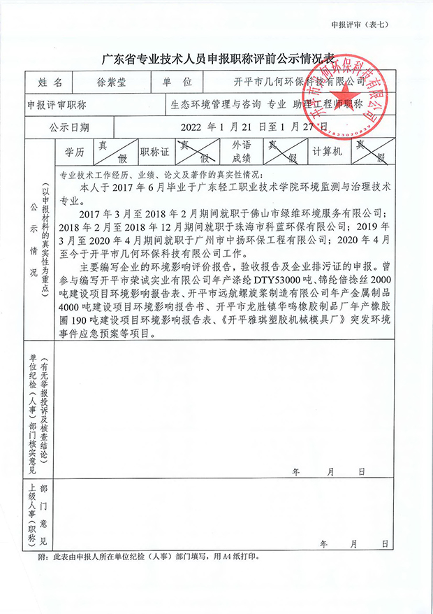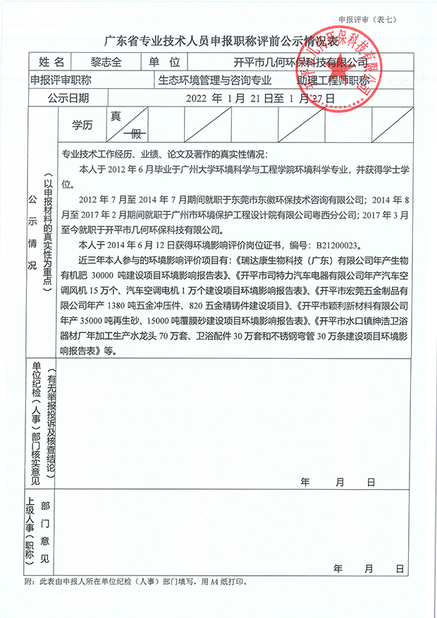 開平市幾何環(huán)??萍加邢薰炯夹g(shù)人員申報(bào)職稱評前公示