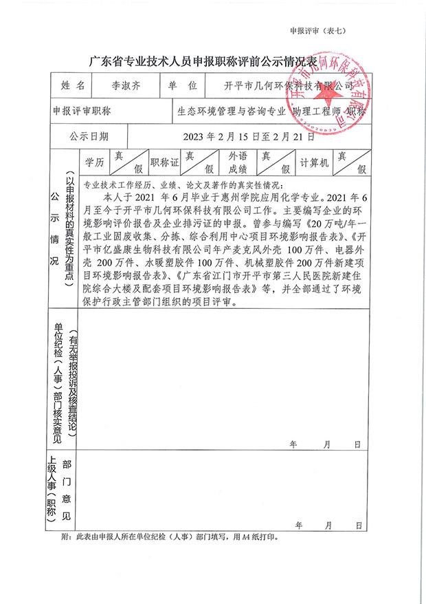 開平市幾何環(huán)??萍加邢薰炯夹g(shù)人員申報職稱評前公示